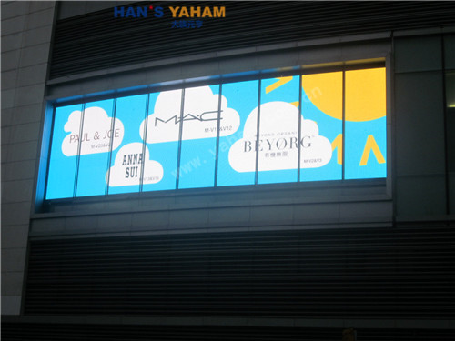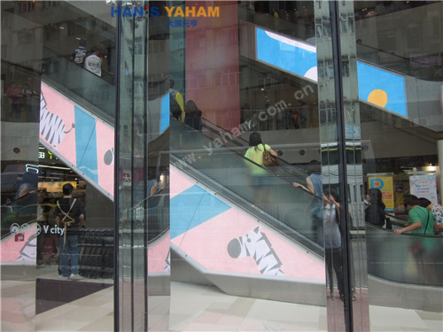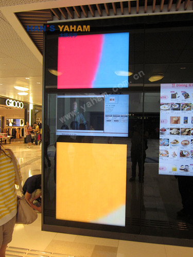 在商場(chǎng)里還可以見(jiàn)到安裝在玻璃幕墻后的16mm全彩屏,與LCD顯示器完美結(jié)合,影像顯示效果可媲美LCD。
