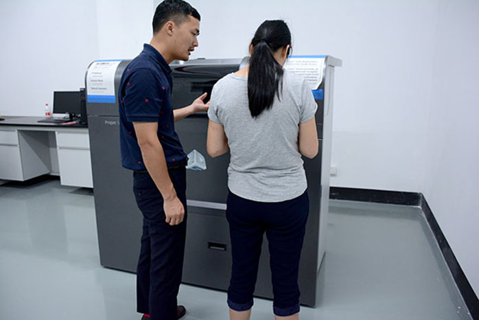 而元亨此次由美國引進的3D打印機使用的是“噴墨”的方式進行運作,也就是用打印機噴頭將一層極薄的液態(tài)塑料物質(zhì)噴涂在鑄模托盤上,再將噴涂好的鑄模托盤置于紫外線下進行處理。隨后鑄模托盤下降一層進行第二層成型。重復(fù)前述程序,繼續(xù)各層成型。