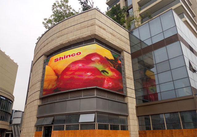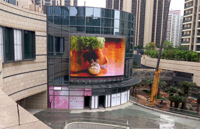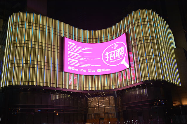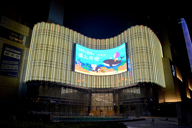 上圖為外弧屏,屏體總面積209平方米,依據(jù)建筑的弧度,內(nèi)嵌于建筑,確保最佳的視覺角度。