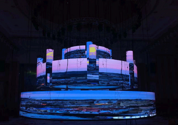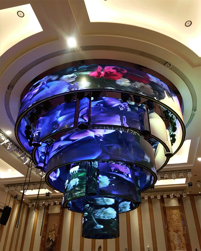 五環(huán)祥云藝術(shù)屏由五個(gè)直徑大小不一的圓環(huán)屏和十二個(gè)圓柱屏組合而成,每個(gè)圓環(huán)又分為外環(huán)與內(nèi)環(huán)。為了保證模組能適用于不同弧度的內(nèi)外弧,整個(gè)項(xiàng)目采用當(dāng)今最先進(jìn)的柔性軟模組。此外,整屏還具有雙面超薄前維護(hù)的特點(diǎn),模組可快速更換。該屏可實(shí)現(xiàn)五環(huán)整體升降,單獨(dú)每一環(huán)靈活升降,2環(huán)弧形屏整體自由升降,4環(huán)弧形屏整體自由升降,2環(huán)8根圓柱整體升降和4環(huán)4根圓柱整體升降的效果,隨著屏體升降,呈現(xiàn)出一副云卷云舒的精妙絕倫的畫面。