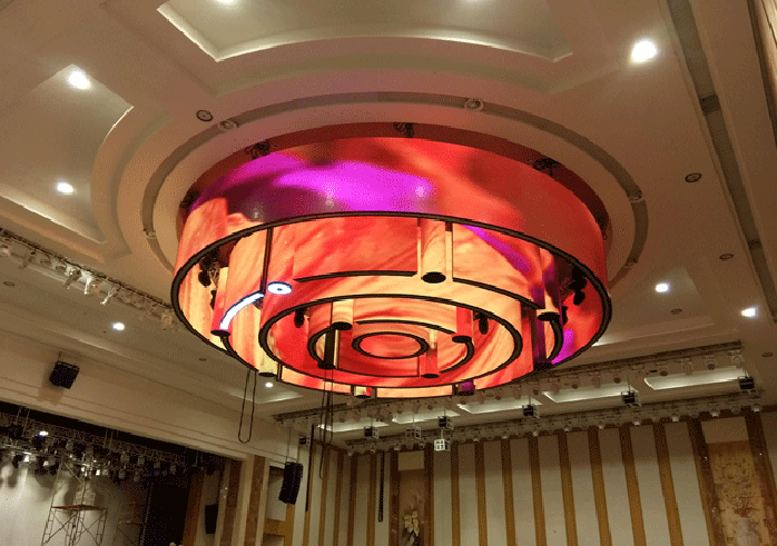 殿堂幾度回環(huán)起,遠(yuǎn)似祥云近霧綃。富麗堂皇的宴會(huì)廳里,五個(gè)由15個(gè)雙面弧形屏、12個(gè)圓柱屏構(gòu)成的總面積超過322m²的大圓環(huán),伴隨著音樂聲靈活升降,標(biāo)志著元亨光電為佛山南海區(qū)西樵鎮(zhèn)金鼎雅致酒店傾力打造的五環(huán)祥云藝術(shù)顯示屏正式完工。