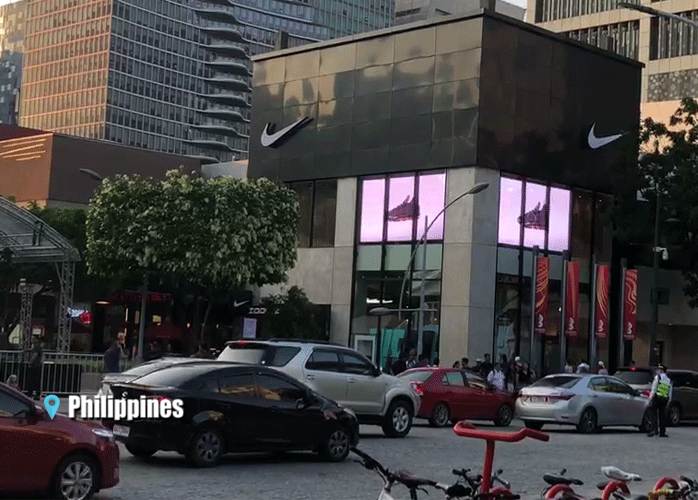 項目簡介:該項目位于菲律賓Nike旗艦店,由于建筑本身帶有龍骨,常規(guī)箱體無法使箱體和窗戶緊密貼合,因此,元亨光電設(shè)計了兩種不同箱體,使安裝的透明屏與原建筑完美貼合。