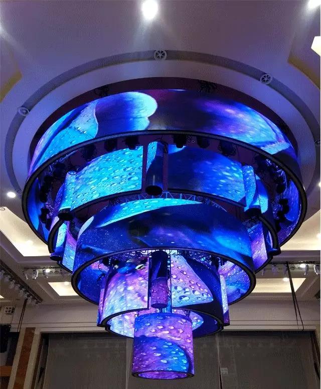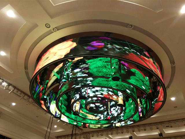 五環(huán)祥云藝術(shù)屏由五個(gè)直徑大小不一的圓環(huán)屏和十二個(gè)圓柱屏組合而成,每個(gè)圓環(huán)又分為外環(huán)與內(nèi)環(huán)。為了保證模組能適用于不同弧度的內(nèi)外弧,整個(gè)項(xiàng)目采用當(dāng)今最先進(jìn)的柔性軟模組。此外,整屏還具有雙面超薄前維護(hù)的特點(diǎn),模組可快速更換。該屏可實(shí)現(xiàn)五環(huán)整體升降,單獨(dú)每一環(huán)靈活升降,2環(huán)弧形屏整體自由升降,4環(huán)弧形屏整體自由升降,2環(huán)8根圓柱整體升降和4環(huán)4根圓柱整體升降的效果,隨著屏體升降,呈現(xiàn)出一副云卷云舒的精妙絕倫的畫面。