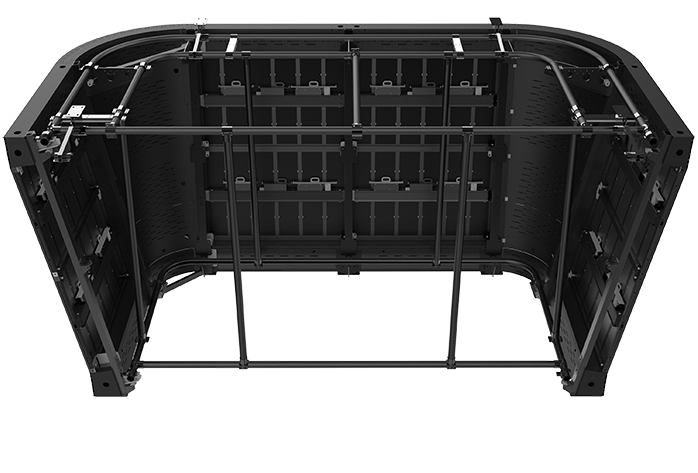 這塊吊斗屏是采用4mm像素間距制作而成的圓錐形吊斗屏,整屏由兩種箱體材質(zhì)打造而成,其中主箱體為1152*768mm的型材箱體,而為了確保箱體之間無縫連接,屏體頂部和底部箱體則采用規(guī)格為1152*192mm的鈑金箱體。