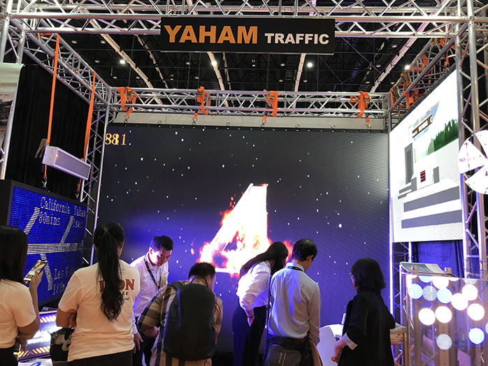 除了租賃屏和常規(guī)交通屏,元亨光電還在本屆展會(huì)上展出了地磚屏。地磚屏的成功應(yīng)用可以追溯至2009年春晚,當(dāng)年央視春晚,LED地磚屏在舞臺(tái)地面的成功使用,讓舞臺(tái)的創(chuàng)意表現(xiàn)力有了新的突破。此后,地磚屏在舞臺(tái)舞美、商演活動(dòng)、酒吧娛樂場(chǎng)所等地面裝飾應(yīng)用成為無可替代的顯示產(chǎn)品。地磚屏與主屏聯(lián)合使用,為舞臺(tái)打造了一個(gè)個(gè)立體動(dòng)態(tài)的顯示效果。