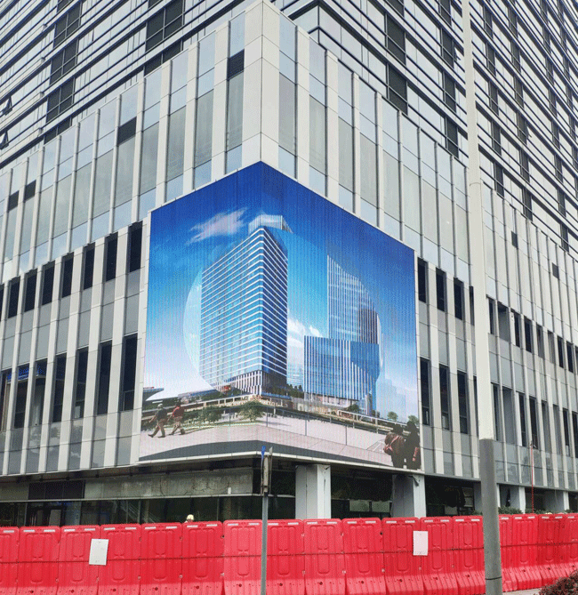 西面商業(yè)外街展示區(qū)作為大廈的重點(diǎn)打造區(qū)域,兩旁綠植與極具現(xiàn)代風(fēng)格的LOGO相互映襯,而大廈轉(zhuǎn)角處的LED無縫轉(zhuǎn)角屏的加入則成為了大廈的點(diǎn)睛之筆。這塊由元亨光電打造的面積達(dá)221平米的超大型轉(zhuǎn)角屏,采用元亨光電無縫轉(zhuǎn)角專利技術(shù),在轉(zhuǎn)角處巧妙利用尖角過渡模組,將兩塊顯示屏連接在一起,使顯示屏完全貼合建筑90°轉(zhuǎn)角墻面,并且兼顧轉(zhuǎn)角處平滑無縫過渡,消除傳統(tǒng)拼接轉(zhuǎn)角不可避免的黑縫問題,完美呈現(xiàn)整屏立體式效果。