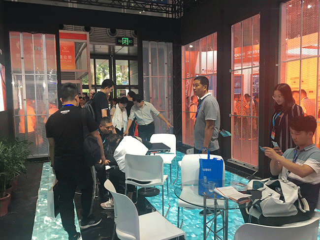同時,展位減少了木板墻體,改用元亨C系列透明屏,通透率高達70%的透明屏,兼顧采光以及內(nèi)容展示,播放畫面懸浮于屏幕之上,打造高端透明櫥窗效果,配以逼真的動畫視屏,吸引往來觀眾紛紛駐足觀賞,不少國外游客對元亨透明屏表示驚嘆。