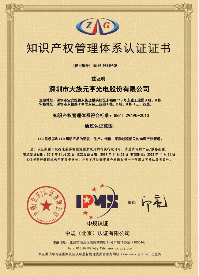 近日,元亨順利通過《企業(yè)知識產(chǎn)權(quán)管理規(guī)范》國家標(biāo)準(zhǔn)審核認(rèn)證,通過認(rèn)證范圍包括:LED顯示屏和LED照明產(chǎn)品的研發(fā)、生產(chǎn)銷售、采購過程相關(guān)的知識產(chǎn)權(quán)管理。