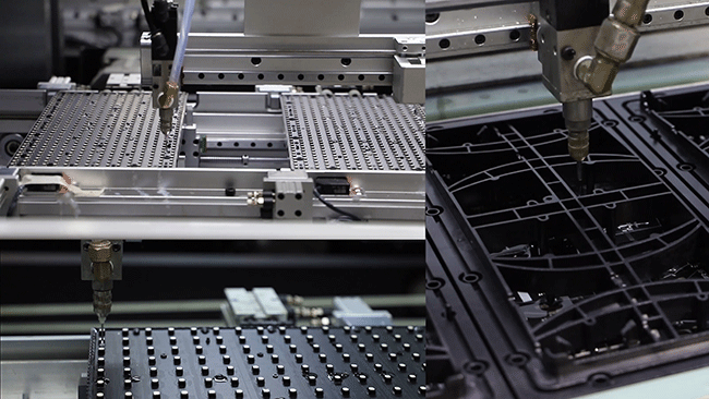引進(jìn)全自動底殼裝配線實(shí)現(xiàn)全自動噴涂、螺絲鎖緊、點(diǎn)膠等功能,噴涂機(jī)采用雙頭噴涂模式,提升效率。全自動底殼裝配線引進(jìn)后,工作效率由人均300/11提升至100/1,由人工搬運(yùn)導(dǎo)致的產(chǎn)品損壞率減少,設(shè)定程序批量操作大幅度提升了產(chǎn)品合格率。