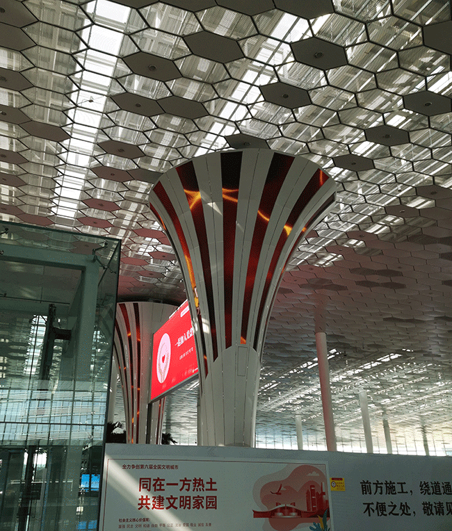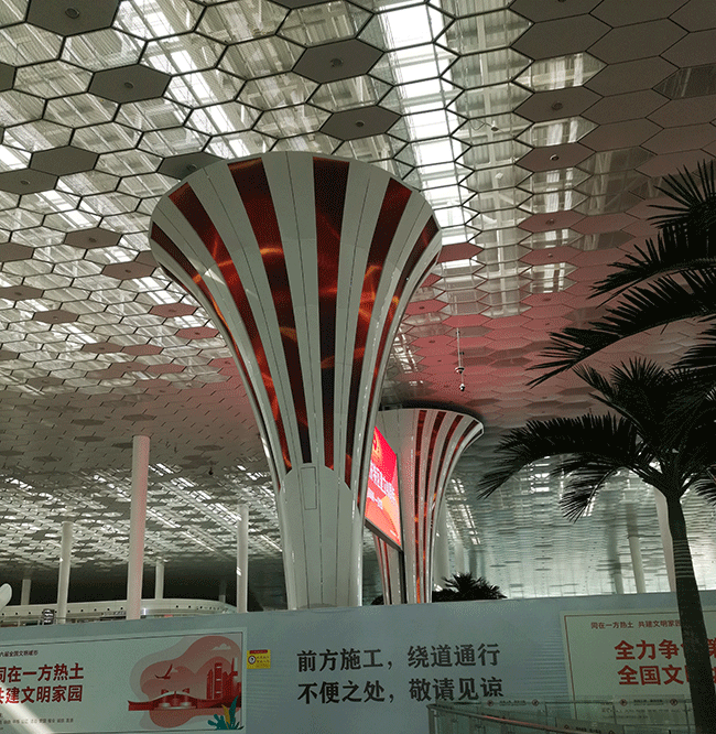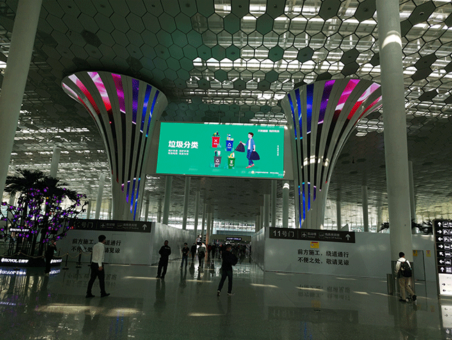 如果說,一周前深圳機(jī)場交通運(yùn)營中心在建的創(chuàng)意LED屏還是一位“千呼萬喚始出來,猶抱琵琶半遮面”的少女,那么正式完工后的它,就是一位出落得亭亭玉立的佳人,在深圳機(jī)場這條“大飛魚”里,笑迎八方來客,從深圳出發(fā),看世界。