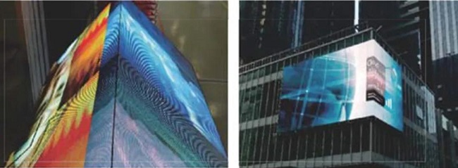 常規(guī)的顯示屏為二維平面,無論播放2D還是3D內(nèi)容,都不會讓觀者在裸眼觀看的時候有立體感。但是,當(dāng)我們采用90°直角的弧度來安裝,實現(xiàn)一個非二維的顯示面,就可以實現(xiàn)裸眼3D顯示的效果了。