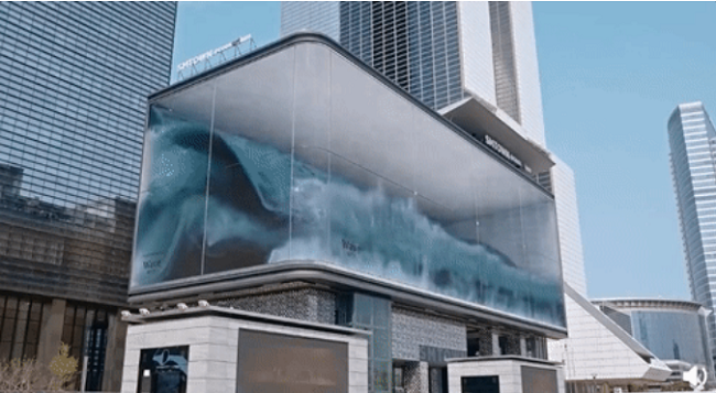 尤其是2020年,當(dāng)首爾著名商業(yè)中心的一塊戶外轉(zhuǎn)角LED顯示屏上出現(xiàn)了一款模擬巨浪翻滾的影像作品后,瞬間吸引了全球人的目光:寫實的巨浪畫面每天不間斷地播放著,令整座建筑仿佛是一個搖晃的巨大水箱。